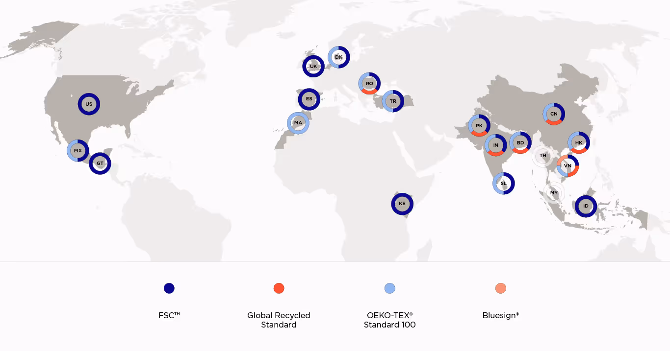 Due to the rising awareness and focus on the global environmental problems and increasing consumer pressure, we always strive to improve our production’s environmental performance and to follow international standards and regulations. Approved products, materials, and processes are essential to responsible production. Using ProductDNA®, we have generated the map above to highlight our production facilities’ sustainability certificates, with an easily accessible overview of available up-to-date certificates.